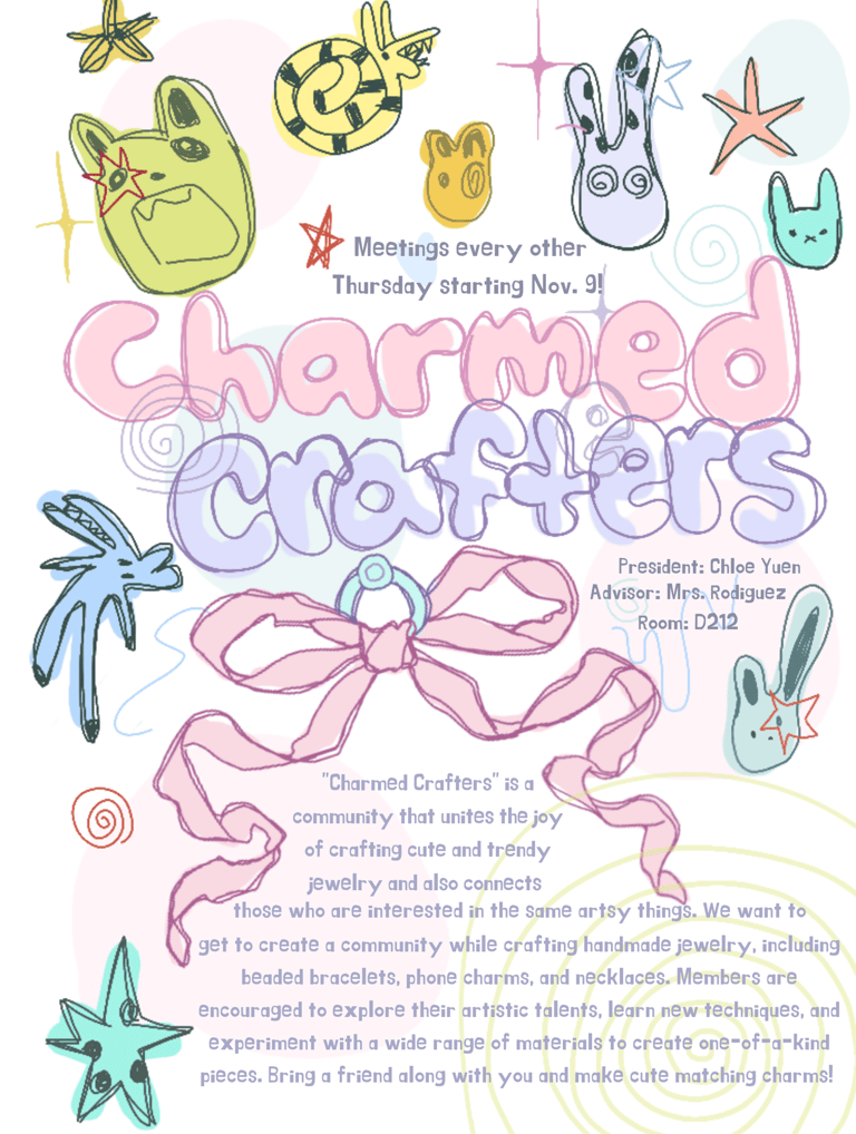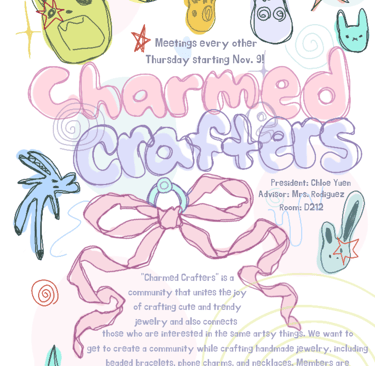 Charmed Crafters is a student-led creative club dedicated to designing, hand-crafting, and sharing unique phone charms and accessories. Our mission is to give students a space to explore their artistic interests, learn new crafting techniques, and express themselves through wearable art. Whether you’re a beginner or already passionate about jewelry-making, we welcome everyone who wants to create, collaborate, and have fun.